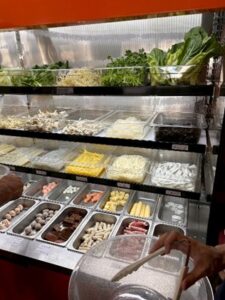 • お店に入ったらボウルとトングを渡される。冷蔵庫に沢山の具材が並んでいるため、好きな具材をボウルに取っていく。具材の量(重さ)で値段が決まる仕組みだ。ちなみに具材の種類は値段に関係ない。重さのみで決まる。